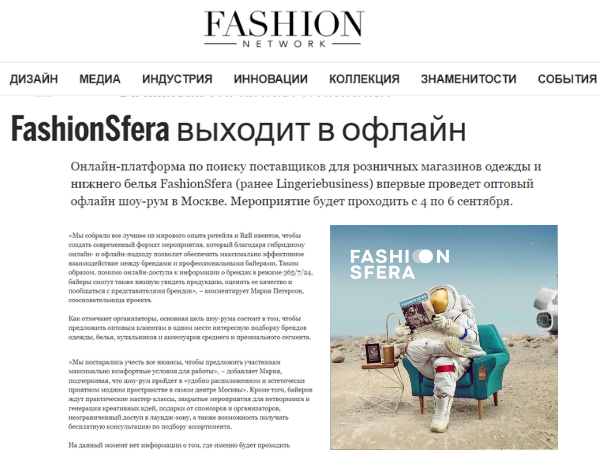 Онлайн-платформа по поиску поставщиков для розничных магазинов одежды и нижнего белья FashionSfera (ранее Lingeriebusiness) впервые проведет оптовый офлайн шоу-рум в Москве. Мероприятие будет проходить с 4 по 6 сентября.